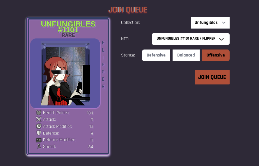 Pushing the "Join Queue" button and signing the transaction will start an asynchronous flow and eventually your NFT will join the next available Battle Royale.